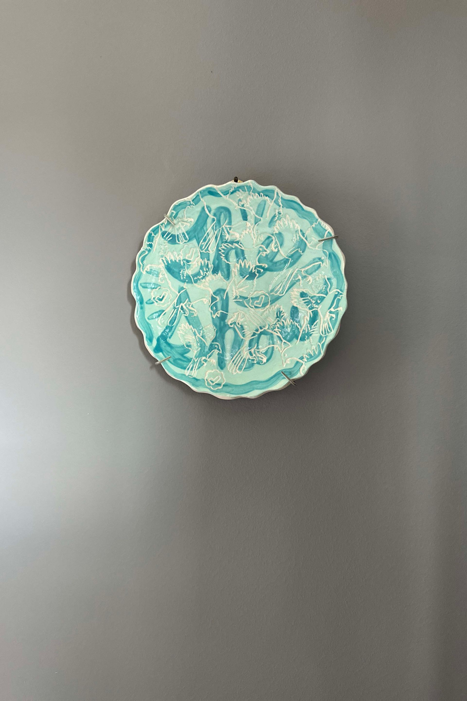 2021, 8 in. x 8 in. x .5 in., White Stoneware with sgraffito carved colored porcelain slips, fired to cone 6 oxidation