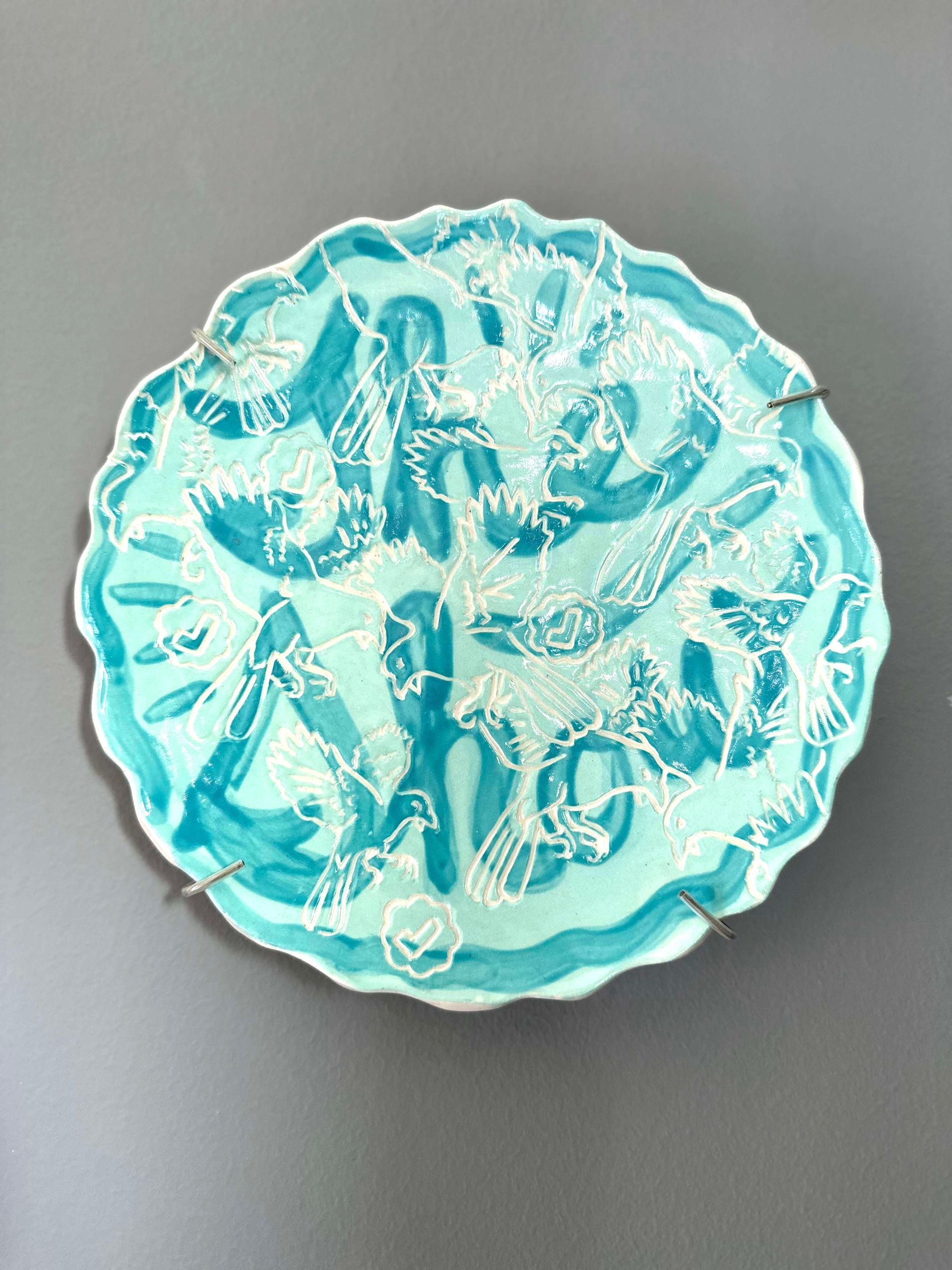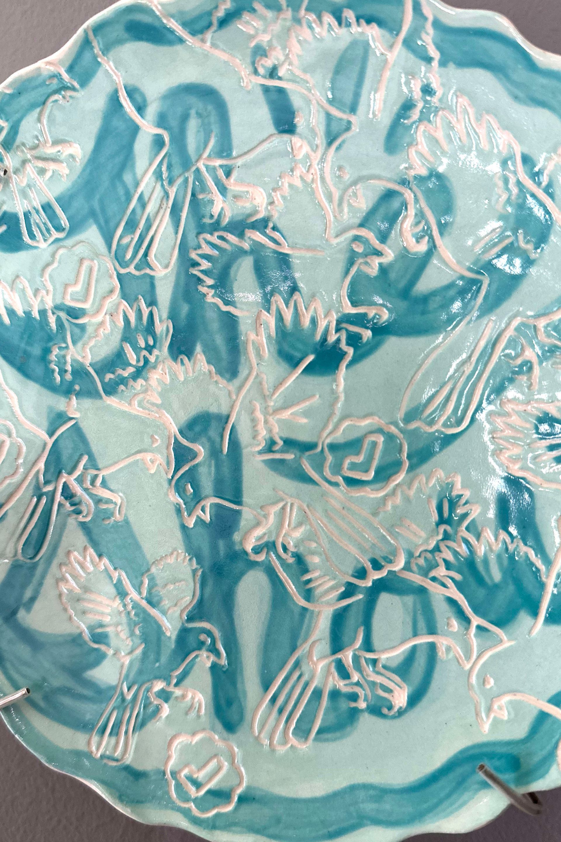 2021, 8 in. x 8 in. x .5 in., White Stoneware with sgraffito carved colored porcelain slips, fired to cone 6 oxidation